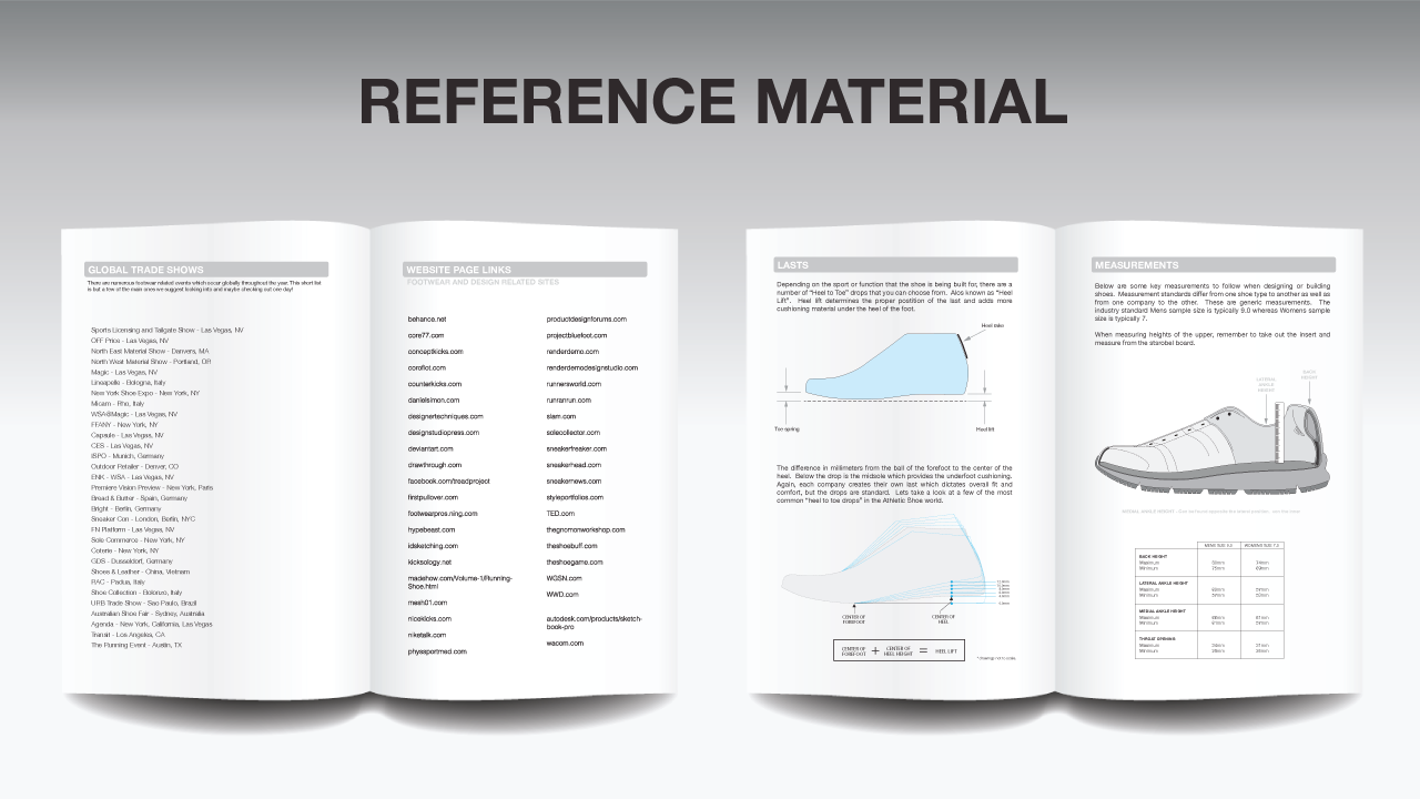 This sketchbook contains general footwear knowledge, terms, industry information, reference materials and more. It’s more than just a typical plain old sketchbook filled with blank pages. Perfect for beginners that are interested in how to draw shoes.