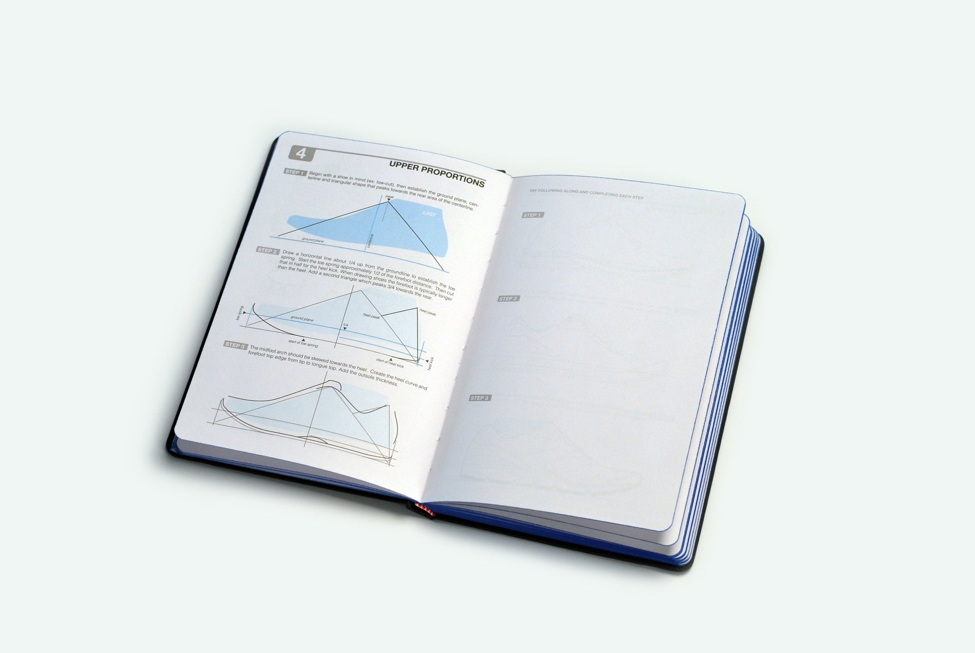 This sketchbook is a great tool for students, sneaker enthusiasts and designers looking to learn how to draw shoes. Learn how to set up different perspective views including side, front, heel, top down, bottom and more. It contains over 100 non-photo blue templates and guidelines that you can use as underlays to sketch your own shoe designs.